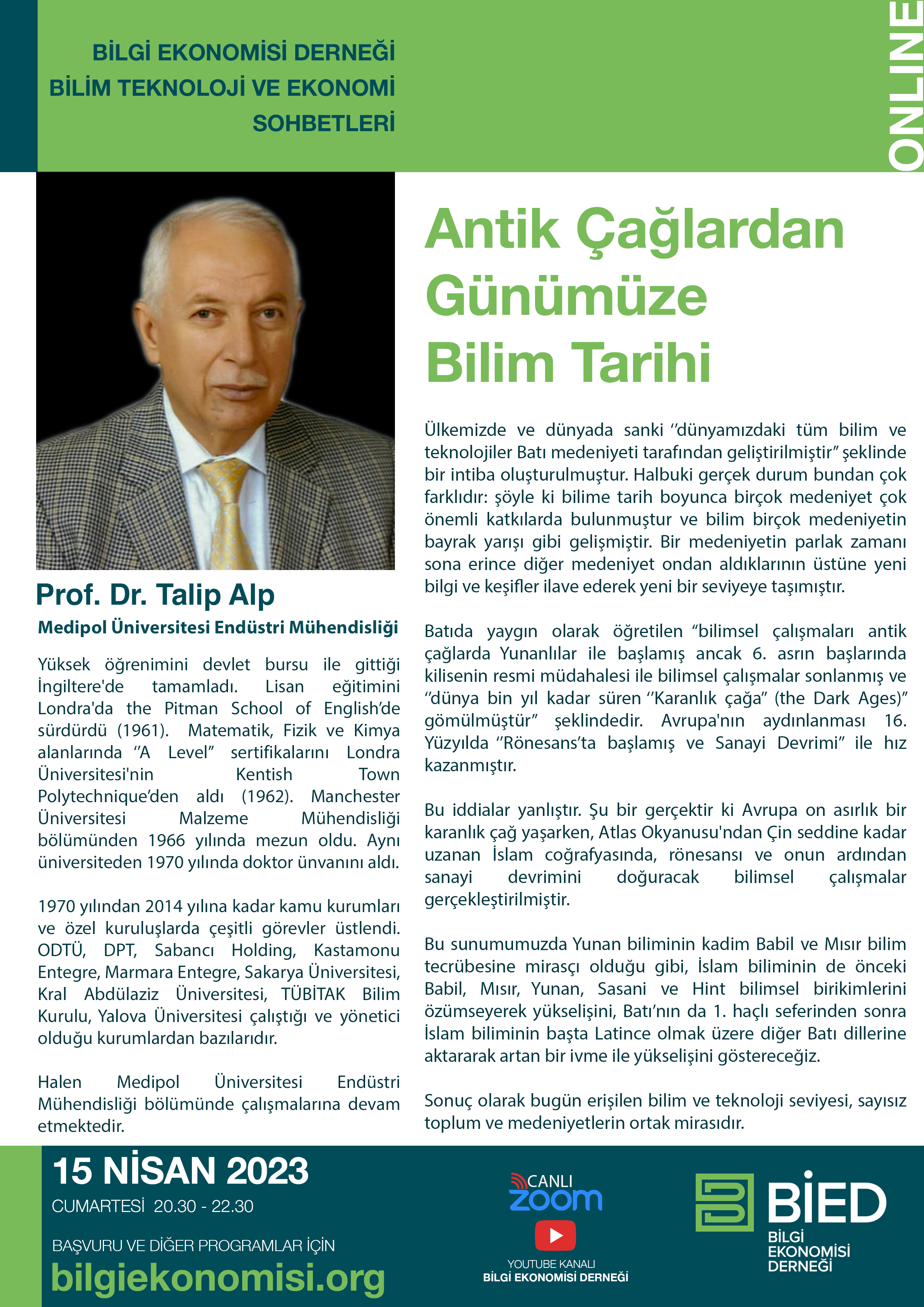 Bilgi Ekonomisi Derneği olarak 2 haftada bir organize ettiğimiz Bilim, Teknoloji ve Ekonomi Sohbetlerine davetlisiniz. Türkiye'den ve dünyanın farklı noktalarından öncü bilim insanlarını bu sohbetlere davet ederek sizlerle buluşturuyoruz.